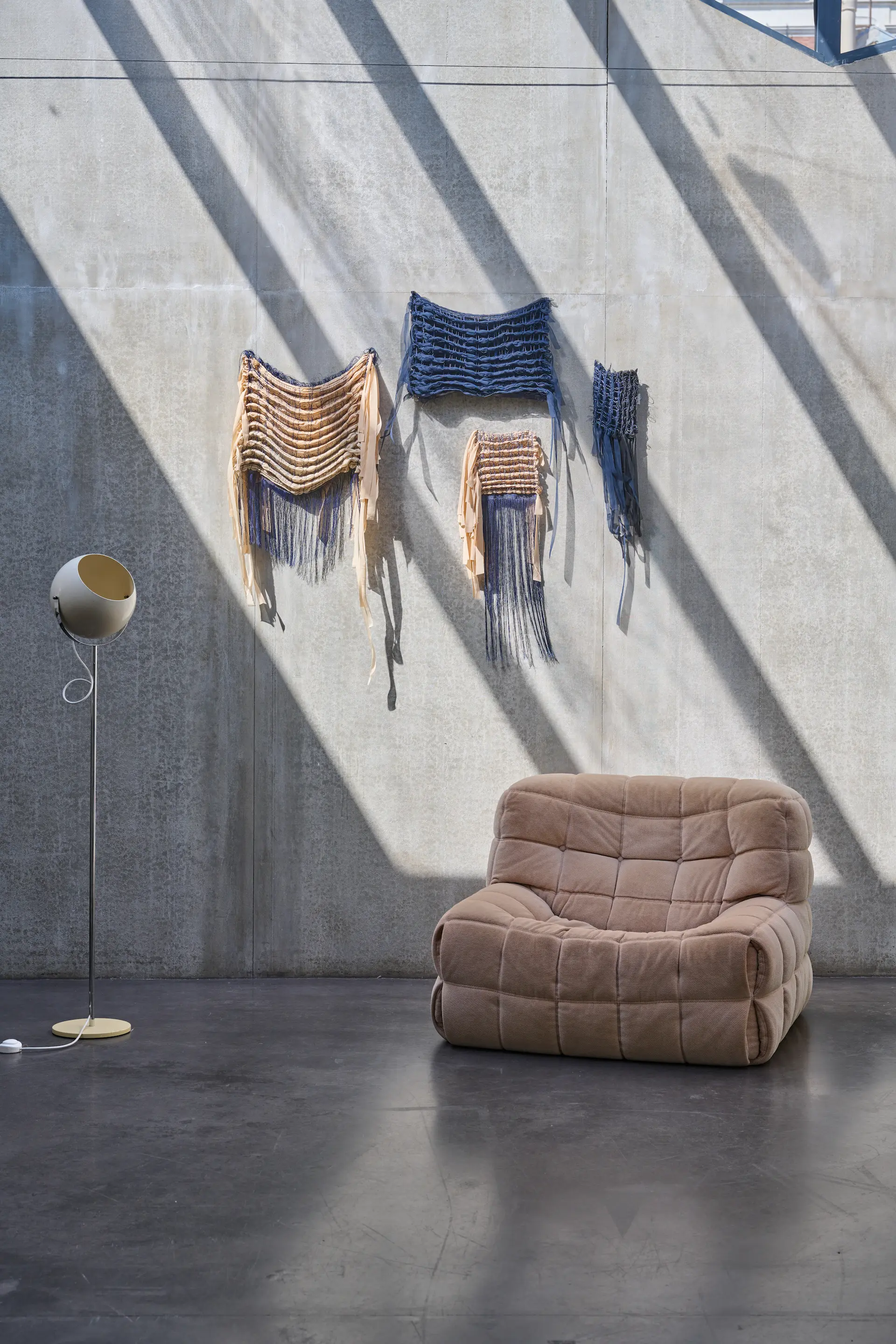 L’atelier développe des pièces textiles architecturales destinées à l’habillage de l’espace — cloisons, panneaux muraux, suspensions ou filtres lumineux — conçues sur mesure pour des projets d’architecture intérieure.
